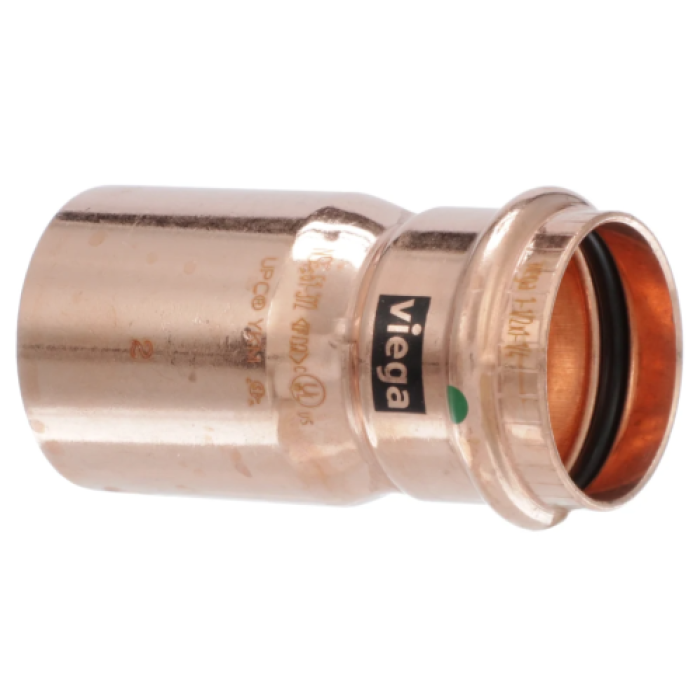 Viega Tube Reducer, Series: 2915.1 Series, Reducer Fitting, 1-1/2 in Connection Size 1, CTS Connection Type 1, 1-1/4 in Connection Size 2, Press Connection Type 2, CTS|Press Connection, Copper, Copper Material Construction, For Use With: Viega ProPress® ASTM B88 and B75 Tubings, 3.07 in L Dimensions, 300 psi Pressure, 0 to 250 deg F