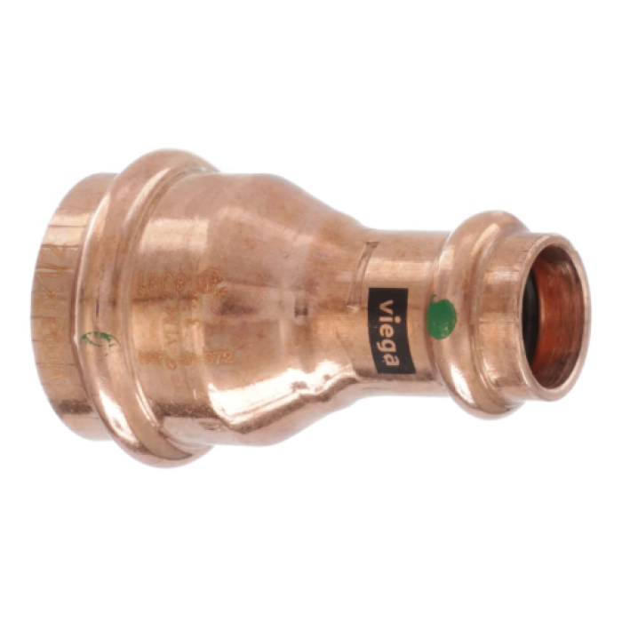 Viega Tube Reducer, Series: 2915.2 Series, Reducer Fitting, 1 in Connection Size 1, Press Connection Type 1, 1/2 in Connection Size 2, Press Connection Type 2, Press|Press Connection, Copper, Copper Material Construction, For Use With: Viega ProPress® ASTM B88 and B75 Tubings, 2.36 in L Dimensions, 300 psi Pressure, 0 to 250 deg F
