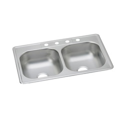 Elkay® Sink, Traditional Theme/Style, Center Drain Location, 3-1/2 in Drain, 4 in Faucet Center, 22 ga Gauge, Stainless Steel, Satin, 4 Holes, Drop-In Mounting, 2 Bowls, Rectangular Shape, 14 in L x 15-3/4 in W x 6-7/8 in D Sink Bowl Size (Right), Sink Bowl Size (Single or Left): 14 in L x 15-3/4 in W x 6-7/8 in D, 36 in Minimum Cabinet, 32-3/8 in L x 21-3/8 in W Cutout, 1-1/2 in Faucet Hole, 33 in Length, 22 in Width, 7.06 in Height, Domestic/Import: Domestic