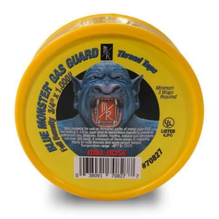 Monstrous 1000 in roll. Color-coded yellow for easy identification by gas companies worldwide. Blue Monster gas guard PTFE thread sealing tape is designed specifically for gas lines. This is a full or maximum-density thread sealing tape. Blue Monster gas guard tape is approved by relevant authorities and used by the gas industry worldwide. It's color-coded yellow so fitters and inspectors can easily recognize it as an approved tape. Ideally suited for natural gas, propane and butane lines. Use on threads of approved gas piping systems. Use on pipe made from galvanized steel, iron, brass, copper, aluminum, stainless steel, polyethylene, polypropylene, PVC, CPVC, ABS and fiberglass. Do not use Blue Monster gas guard thread seal tape on oxygen systems.