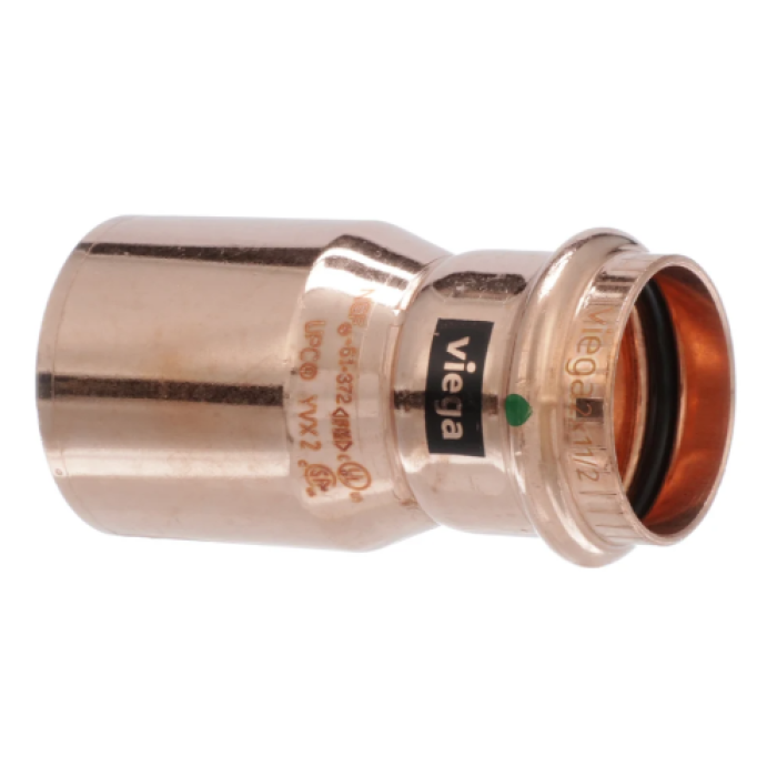 Viega Tube Reducer, Series: 2915.1 Series, Reducer Fitting, 2 in Connection Size 1, CTS Connection Type 1, 1-1/2 in Connection Size 2, Press Connection Type 2, CTS|Press Connection, Copper, Copper Material Construction, For Use With: Viega ProPress® ASTM B88 and B75 Tubings, 4.06 in L Dimensions, 300 psi Pressure, 0 to 250 deg F