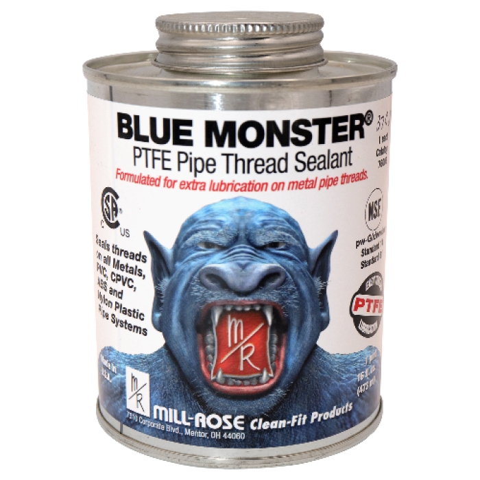 Blue Monster® PTFE pipe thread sealant is formulated with PTFE resin, a polymer consisting of recurring tetrafluoroethylene monomers whose formula is (CF2-CF2). It is inert and compatible with a very wide range of materials. Use Blue Monster® on threads made from all metals, PVC, CPVC, ABS and nylon plastic pipe systems. Now available in a convenient 2 oz squeeze tube. Specially formulated for extra lubrication on metal pipe threads. Ideal, compact size for any tool box or storage bin. Non-hardening, slow drying soft set formula is non-toxic and grit-free.