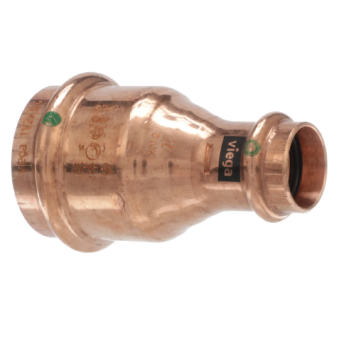 Viega Tube Reducer, Series: 2915.2 Series, Reducer Fitting, 1-1/2 in Connection Size 1, Press Connection Type 1, 3/4 in Connection Size 2, Press Connection Type 2, Press|Press Connection, Copper, Copper Material Construction, For Use With: Viega ProPress® ASTM B88 and B75 Tubings, 3.33 in L Dimensions, 300 psi Pressure, 0 to 250 deg F
