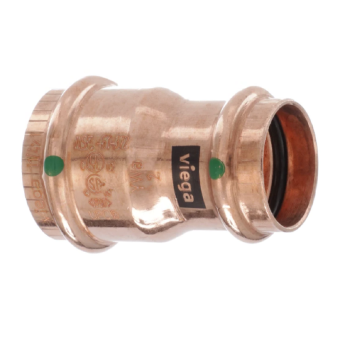 Viega Tube Reducer, Series: 2915.2 Series, Reducer Fitting, 1-1/4 in Connection Size 1, Press Connection Type 1, 1 in Connection Size 2, Press Connection Type 2, Press|Press Connection, Copper, Copper Material Construction, For Use With: Viega ProPress® ASTM B88 and B75 Tubings, 2.48 in L Dimensions, 300 psi Pressure, 0 to 250 deg F
