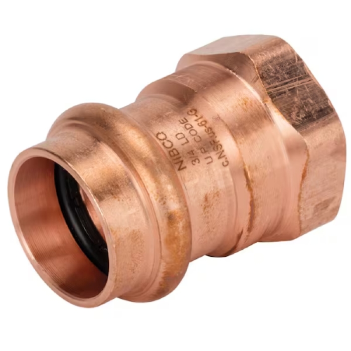 NIBCO® Adapter, Adapter Fitting, 3/4 in Connection Size 1, Press Connection Type 1, 3/4 in Connection Size 2, FNPT Connection Type 2, Press|FNPT Connection, Copper, Copper Material Construction, 1.71 in L x 1.33 in W Dimensions, 200 psi Pressure, -20 to 250 deg F